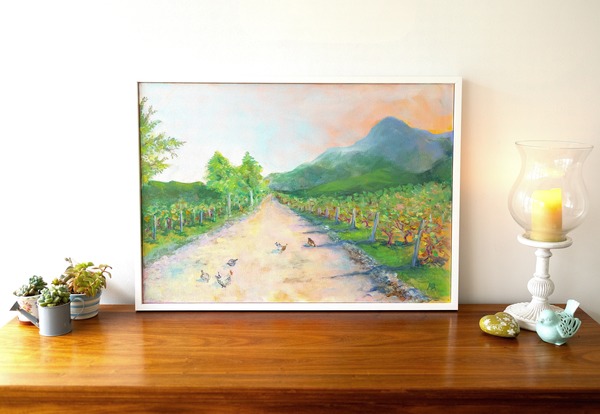 Creation in the Hemel and Aarde valley near Hermanus is one of my favourite wine farms. This painting is of the winding, tree-lined dirt road leading to its fabulous restaurant and tasting room. I took the reference photo while with my dear friend Julie who regularly visits us from Scotland. It was a crisp June morning at the start of her trip and I wanted to capture the gentle but joyful promise of the day ahead.